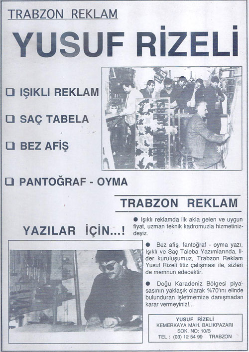 Yusuf Rizeli Reklamcılık ve Dijital Baskı Merkezi, 1982’den beri sizlerle Reklamcılık hizmetlerini ve çalışmalarımızı ilk günkü heyecan, istek ve inançla sürdürüyoruz. Tek ilkemiz koşulsuz müşteri memnuniyetidir. Geçen zaman içinde daima kendimizi güncel tutup ürün ve hizmet kalitemizi devamlı geliştirerek sektörün en geniş kapsamlı, en istikrarlı ve hep en iyiyi kendine hedef alan bir firma haline geldik. Bundan böyle de sektörün en önde gelen kuruluşu olarak, yüksek birikim ve potansiyelimize bir yenisini daha ekledik. Yusuf Rizeli Dijital Baskı Merkezi olarak dalında en son teknolojik özelliklere sahip olan ROLAND AJ-1000 geniş formatlı baskı makinesi, TEMEI LM-10568 lazer kesim makinesi ve süblimasyon baskı makinesiyle makine parkımızı genişletmiş ve aklınıza gelebilecek bütün açık hava reklamcılığı ve promosyon ürünlerinde sizlere en kaliteli ve en güvenilir hizmeti vermeye devam edeceğiz. Dünden bugüne geldiğimiz noktadan, yarınlara potansiyelimizi daha ileriye, daha iyiye ve daha kaliteliye taşımak tabi ki sizlerin yadsınamaz katkılarıyla olacaktır.